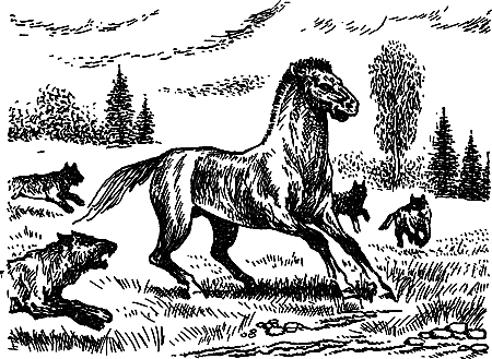 Волчий вой возобновился. Он слышался одновременно у реки и в глубине зарослей. Нао догадался, что волки окружили добычу. На равнине появилось животное, похожее на лошадь, но только с очень узкой грудью и с коричневой полосой вдоль позвоночника. Это был джигетай. За ним гнались три волка. Они бежали медленнее джигетая и как будто вовсе не торопились, то и дело перекликаясь с волками, сидящими в засаде. Вскоре высыпала и остальная стая. Джигетай был окружен со всех сторон. Он остановился, весь дрожа, выбирая дорогу для отступления. Пробраться можно было только на север, где маячил всего-навсего один волк. Затравленный зверь избрал этот путь. Волк с кажущимся безучастием смотрел на его приближение, но едва джигетай сделал движение, чтобы обойти его стороной, волк испустил страшный вой. На холме появились еще три волка.