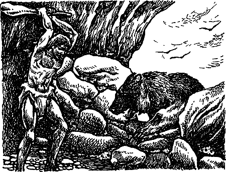 Нао и Гав отскочили в глубь пещеры; Нам очутился в объятиях чудовищных лап. Он и не думал защищаться; он походил на антилопу, схваченную пантерой, на лошадь, поваленную львом. Опустив руки, широко раскрыв рот, он ждал смерти в приступе какого-то оцепенения. Но Нао, вначале растерявшись, быстро обрел тот воинственный пыл, что порождает героев. Он отбросил топор, считая его бесполезным, и схватил обеими руками дубовую, суковатую палицу. Заметив Нао, медведь бросил свою слабую, трепещущую в его лапах добычу и двинулся на более опасного противника. Но он не успел пустить в дело свои лапы и зубы, уламр занес над ним палицу. Оружие опередило. Удар пришелся по челюсти медведя, задев