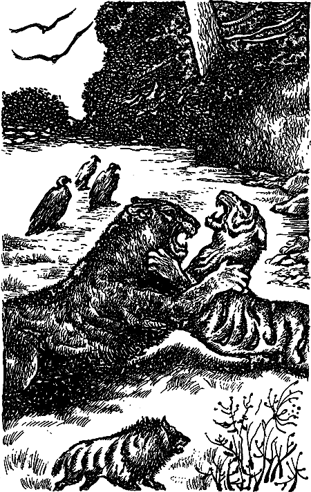 Голод заставил его повернуться в сторону того теплого запаха, который шел из внутренностей побежденного тигра; он подошел к жертве, обнюхал ее: она была отвратительна, как отрава. С внезапной свирепостью он прыгнул на тигра, сломал ему позвоночник и, бросив труп, пошел дальше в саванну.