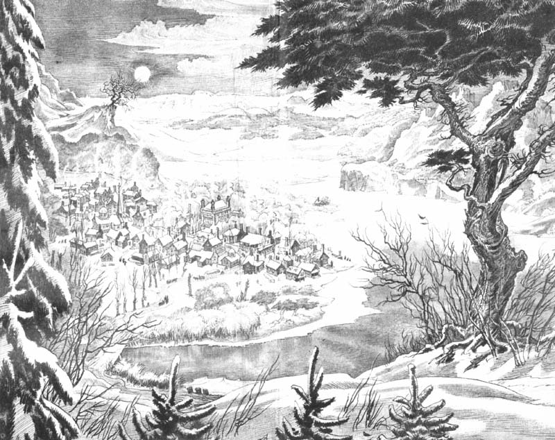 Гора, по которой они ехали, заросла гигантскими соснами, чьи стволы уходили ввысь на семьдесят — восемьдесят футов, прежде чем от них ответвлялся первый сук, а высота кроны тоже нередко достигала восьмидесяти футов. Гордые лесные великаны почти не закрывали далей, и наши путешественники могли видеть даже вершину горы на противоположной стороне долины, куда лежал их путь; лишь порой ее заслонял какой-нибудь отдаленный холмик. Темные стволы стройными колоннами поднимались над белым снегом, и лишь на головокружительной высоте взгляд наконец встречал ветви, покрытые скудной вечнозеленой хвоей, чей мрачный вид представлял меланхолическое несоответствие со всей погруженной в зимний сон природой. Внизу ветра не было, однако вершины сосен плавно раскачивались, глухо и жалобно поскрипывая, — звук этот удивительно гармонировал с окружающим пейзажем.