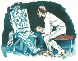 Но вот его взгляд оторвался от панорамного экрана, остановился на счетчике и отошел от него… Что это? Неосознанное чувство вернуло взгляд к счетчику. В маленьком продолговатом оконце тускло светится непривычная цифра! И тотчас человек пробудился. Оттолкнувшись от кресла, он быстро подошел к пульту. Нажатие клавиш — и прямо а руки его потекла лента с текстом: «Температура брони повысилась! Интенсивность, радиоактивного излучения возросла! Вступаем в космическое облако метеоритной пыли и газов!»