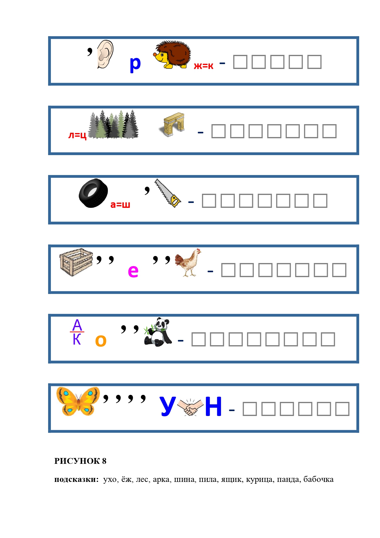 РИСУНОК 8: хорёк, цесарка, шин шила, ящерица, анаконда, бабуин