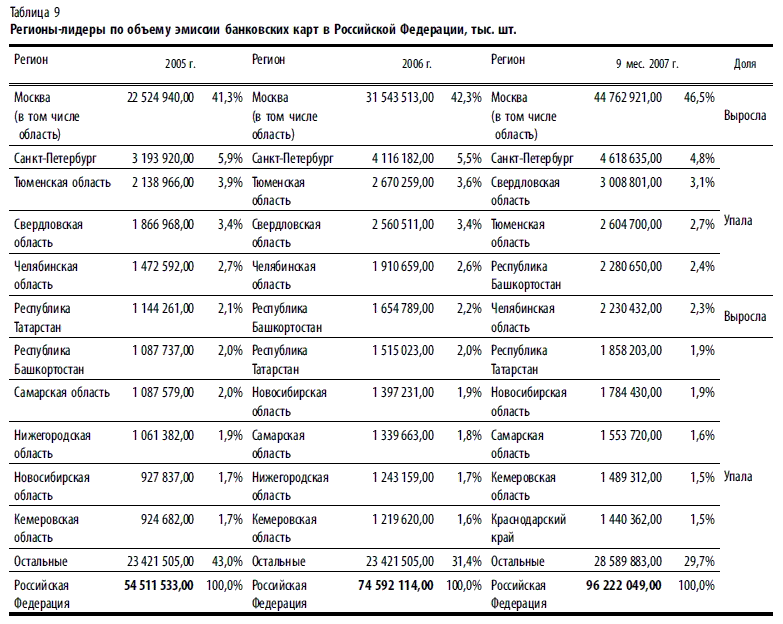 Региональная дифференциация рынка по эмиссии банковских карт значительно меньше, чем по объему торгового эквайринга, однако она превышает дифференциацию регионов по объему снятия наличности. По итогам 9 месяцев 2007 г. у 6 регионов доля по объему эмиссии банковских карт более 2 %. Доля Москвы и Московской области по количеству эмитированных карт больше, чем доля по объему снятия наличных, но меньше, чем доля по объему операций по торговому эквайрингу.