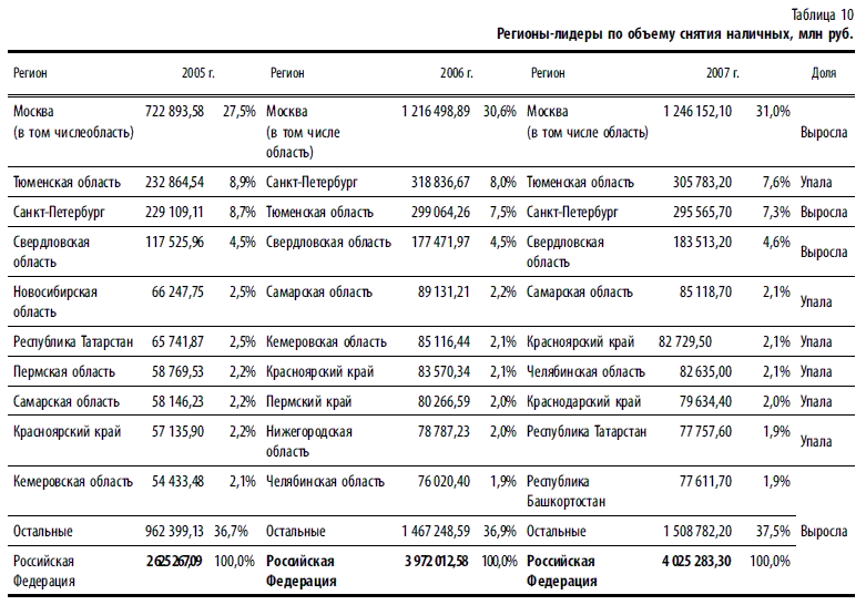 Как видно из приведенных цифр региональная дифференциация операций по снятию наличных гораздо менее существенная. Если по торговому эквайрингу по итогам 9 месяцев 2007 г. только 4 региона занимают долю более 2 %, то по оборотам по снятию наличных таких регионов 8, и еще 2 региона — с долей, очень близкой к 2 %. Для Москвы и Московской области по объемам снятия наличных составляет 31,0 %, что почти в 2 раза ниже, чем по объему торгового эквайринга. Также важно отметить, что доля регионов, не вошедших в ТОП-10 по снятию наличных, составляет 37,5 %, что в 2 раза больше, чем аналогичный показатель по торговому эквайрингу. Если сравнивать состав десятки регионов-лидеров, то среди них — практически одни и те же регионы. Единственное существенное отклонение — среди лидеров по торговому эквайрингу нет ни Татарстана, ни Башкортостана, несмотря на значительный экономический потенциал указанных регионов, а также высокие показатели среднедушевого дохода (это можно объяснить особенностью локальных культур, когда население предпочитает видеть «живые» деньги в форме денежной наличности).