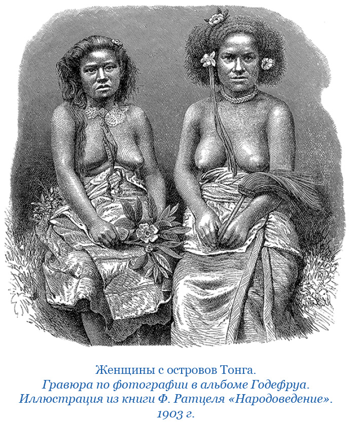 Мирные предприятия их, в которых страсти не участвуют, не могут не быть угодны высшему существу и не нуждаются в кровавых жертвах: успех их зависит от собственного их искусства, и, стало быть, нет надобности им прибегать к кровавым гаданиям для вопрошения судьбы. Одинаковые топоры каменные и из раковин, удочки, тол каролинцев и маро восточных океанийцев, весьма сходные пантомимные пляски, одинаковый способ добывать огонь, печение плодов в земле, сека на Юалане и кава на Таити и других островах, оба приготовляемые из корня перечного растения, – все эти черты сходства неужели случайны? Можно бы привести много других примеров, но, кажется, и этого довольно, чтобы убедиться в происхождении от одного корня народов, о которых говорим. Мы должны только заметить еще, что каролинцы как внешним видом, так и в других отношениях имеют больше сходства с жителями островов Тонга, нежели с островитянами других мест Полинезии. В особых домах, посвященных божествам, на островах Тонга нет безобразных резных идолов; жрецы их не составляют особого сословия, а смешиваются с другими классами; память умерших старшин сохраняется в поколениях, и могилы их почитаются священными; мужья обращаются с женами уважительно, не утруждая их работами; жены отличаются целомудрием и привязанностью к мужьям, оба пола – нравственной чистотой, необыкновенной на островах Товарищества, Сандвичевых и других; в беседах их замечается особенная пристойность и вежливость, – все эти черты различия между островитянами Тонга и другими служат сходством между ними и каролинцами.