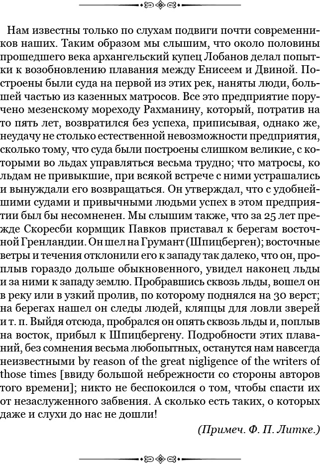 Говоря об открытии Новой Земли, я разумею первые достоверные сведения о ней, достигшие народов просвещенной тогда части Европы. В пространнейшем смысле первыми открывателями этой земли были, без сомнения, россияне, обитатели Двинской области. Настоящее ее название, которого никогда и никто у нее не оспаривал, достаточно это доказывает. Замечательно, что ни одному из мореплавателей XVI и XVII веков, имевших особенную страсть давать свои имена землям и местам, уже прежде открытым и названным (что они доказали на материке и островах, прилежащих к Новой Земле), не пришло в мысль переименовать по-своему и эту последнюю. Самые первые из них говорят о ней, как земле, о которой они уже прежде слышали. Они находили на отдаленнейших к северу ее берегах кресты со славянскими надписями, развалины жилищ и прочее. Русские мореходы, им встречавшиеся, указывали путь, давали наставления. Все это доказывает, что россиянам в половине XVI века все берега Северного океана были подробно известны, следовательно, мореходствовать по нему начали они уже несколькими веками ранее.