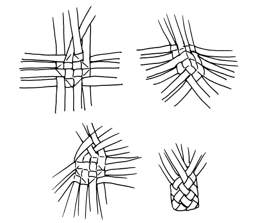 Рисунок 62. Начало плетения стенок корзины, протяжка первой горизонтали