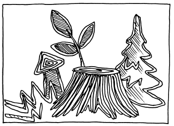 На картоне или холсте произвольно нарисовать 2 пня с зеленеющими листиками. Заготовки-жгутики и саму основу смазывать клеем и выкладывать на нее в соответствии с рисунком жгутики. Сначала выделить контуры, а затем уже начать заполнение внутренних частей (рис. 120).