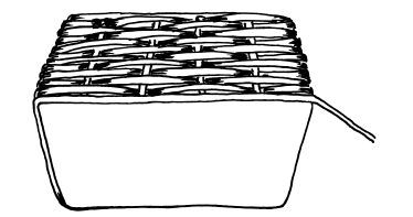 Для того чтобы коробка не двигалась во время плетения, надо положить на дно груз. Для начала плетения согнуть рабочую трубочку пополам, обогнуть первую стойку, намеченную для начала плетения, и плести дальше веревочкой в 2 трубочки. Во время плетения прищепку откреплять для работы с каждой стойкой, затем закреплять снова. Хотя это немного замедляет плетение, но оно выходит ровным. Коробку оплести до самого верха веревочкой в 2 трубочки (рис. 140).