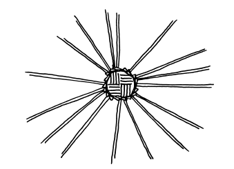 Начиная с крайней стойки, по наружной поверхности крышки надо плести веревочкой в прямом и обратном направлении. Для этого сложить рабочую трубочку пополам, сгибом оплести первую в ряду трубочку и плести веревочкой как обычно до конца ряда. Одним концом рабочей трубочки обогнуть последнюю в ряду стойку и развернуть плетение в обратном направлении. То же самое сделать с концом другой трубочки. Затем начать плести веревочкой в обратном направлении. Дойдя до конца второго ряда, вновь развернуть плетение, как в первом ряду, и плести третий ряд.