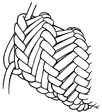 Технология выполнения плетеного ажура ромбиком близка ажурному плетению крестиком. Но при плетении ромбиками не просто производят одинарное перекрещивание стоек, вертикальные стойки перекрещивают 2 или 3 раза. Перед переходом к выполнению ажурного плетения также заканчивают основной рисунок плетением веревочкой. После этого выполняют перекрещивание стоек столько раз, сколько надо по замыслу. Затем снова продолжают плетение веревочкой, а далее выплетают основной рисунок на необходимую высоту. Плетение веревочкой до и после ажурного рисунка способствует надежному закреплению стоек в нужном положении (рис. 33).