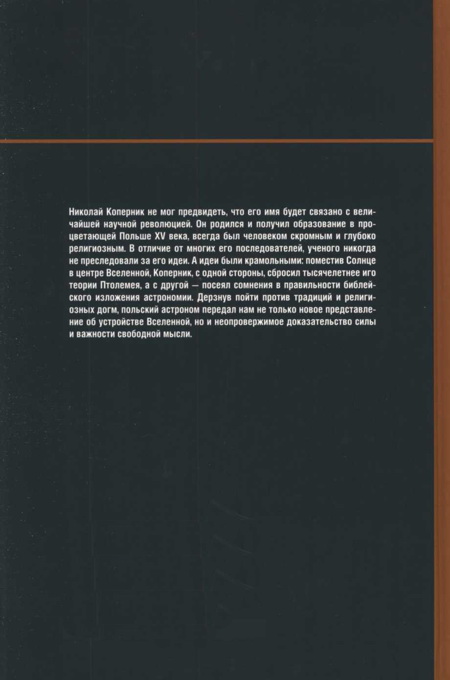 Николай Коперник не мог предвидеть, что его имя будет связано с величайшей научной революцией. Он родился и получил образование в процветающей Польше XV века, всегда был человеком скромным и глубоко религиозным. В отличие от многих его последователей, ученого никогда не преследовали за его идеи. А идеи были крамольными: поместив Солнце в центре Вселенной, Коперник, с одной стороны, сбросил тысячелетнее иго теории Птолемея, а с другой - посеял сомнения в правильности библейского изложения астрономии. Дерзнув пойти против традиций и религиозных догм, польский астроном передал нам не только новое представление об устройстве Вселенной, но и неопровержимое доказательство силы и важности свободной мысли.
