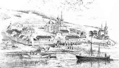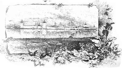 Когда подъезжаешь от Гориц к Кириллову монастырю, перед нами возникает он на берегу озера настоящею, внушительною твердынею в двух своих оградах со множеством куполов. Таких оград нынче не делают: цели нет. Внутренняя имеет 10 аршин вышины при 11/2 аршинах ширины; наружная — 16 при 91/2. За такою бронею и свое время можно было отсидеться. Тихо плещется у стен монастыря Сиверское озеро. Низкие берега его кажутся еще площе, еще низменнее в соразмерности с монастырскими твердынями, плывущими над тихою гладью темных озерных вод. Пейзаж строг, задумчив, но не мрачен.
