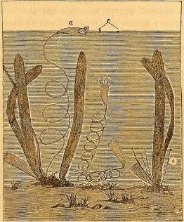 Смотрите, я нарисую вам этот цветок. Он называется валлиснерия. У него мужские цветы на одном растении, а женские на другом. Видите, на какой завитой ниточке растут женские цветы. Наступает время опыления. Мужские цветы