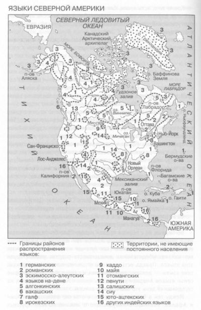 Наконец, все эти языки удивительным образом перемешаны между собой! В самом деле, обычная картина распределения языков на какой-то территории выглядит так, что рядом располагаются родственные или хотя бы похожие языки. Тем более этого следовало бы ожидать в том случае, когда происходило последовательное заселение территории, — но ничего подобного в Северной Америке нет: там сплошь и рядом соседями оказываются языки, принадлежащие к абсолютно разным семьям и имеющие абсолютно разный строй, а это значит, что два соседних языка могут отличаться друг от друга не меньше, чем, например, шведский от чукотского (а если кто-то из наших читателей забыл, в чем разница между аналитическим шведским и инкорпорирующим чукотским, — пусть он заглянет в шестую главу!)