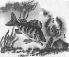 Как потемневшее полено, лежит неподвижная щука. Мелькают красные глаза плотвиц. А на сучках, словно удивительные полосатые птицы, "сидят" окуни. Они таращат слюдяные глаза и жуют белыми губами. А вон окунище под корягой — прямо кабан! Крутой горб, литой бок, диковатый вид. И колючки на горбу, как кабанья щетина.