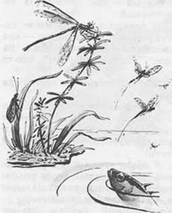 Однажды пронеслась над водой мотыльковая метель. Легкокрылые подёнки устлали воду серыми крылышками. Мальки сейчас же высунули носы из воды. Но тут вдруг страшная чёрная тень пронеслась над их головами. Мальки в ужасе брызнули вниз.
