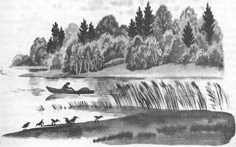 Густые стаи мальков подошли к песчаному пляжу. У берега светло, тепло, и лёгкая волна взмучивает песок. Мальки копошатся в мути, как поросятки. "Поросят" пасут хищные окуни и щучки. Тут и там мелькают их тёмные тела; тут и там мальки в ужасе выскакивают из воды. Некуда малькам податься; впереди берег, позади и с боков — "пастухи". От страха стали на песок выпрыгивать. А на песке две трясогузки — тоненькие, грациозные, ловкие! Подкатывают к малькам, как на колёсиках, хватают тонким клювиком и... глотают!
