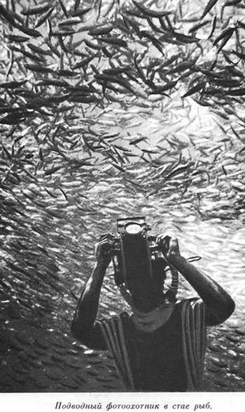 Подводник сам себе водяной змей. На быстром течении — посредине реки, у плотин, водопадов — подводный фотоохотник укрепляет шнур. Надёжно привязывает его к опоре моста, к камню, торчащему из воды, к коряге, замытой песком. А сам, скользя рукой по шнуру, "летит" вниз по течению. На конце шнура — деревянная поперечина. Держась за неё, охотник повисает над дном; под ним бушует вода, бьются, как на сильном ветру, донные водоросли и не спеша проходят против течения рыбы. Можно, подруливая ластами, "покачиваться" на шнуре от берега к берегу — как маятник. Можно подтягиваться то выше, то ниже по течению. Фотоохота тут интересная, но под силу только умелому пловцу и "стрелку"! Плавать надо как выдра и уметь снимать одной рукой и "навскидку".