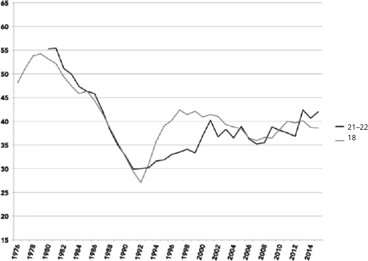 Рис. 1.12.. Процент молодых людей в возрасте 18 лет и в возрасте от 21 до 22 лет, которые за прошедшие 12 месяцев хотя бы однажды принимали наркотики. Monitoring the Future, 1976–2015
