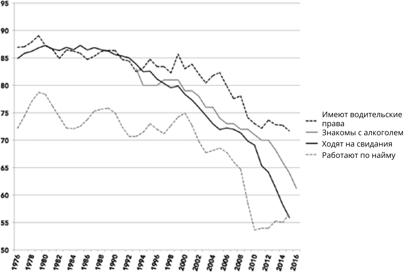 Итак, по сравнению с прошлыми поколениями современные подростки реже гуляют и развлекаются без родителей, ходят на свидания, занимаются сексом, водят машины, работают и употребляют алкоголь. Им неинтересно все то, что обычно делают взрослые, хотя большинство людей всегда приобретало первый опыт взрослой жизни именно в подростковом возрасте.