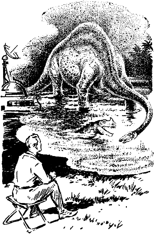 Затем Женя увидел другое чудовище. Оно змеиными движениями скользило рядом с первым, оставляя за собой полосу взбаламученной воды. Один раз оно едва увернулось от колоннообразной ноги диплодока, и на мгновение Женя увидел громадную бледную зубастую пасть. «Что-то будет», — подумал он. Это было гораздо интереснее вспышки сверхновой. Диплодок, видимо, не подозревал о своем зубастом спутнике либо просто не обращал на него внимания. А тот, ловко лавируя вокруг его ног, подобрался поближе к голове, рывком