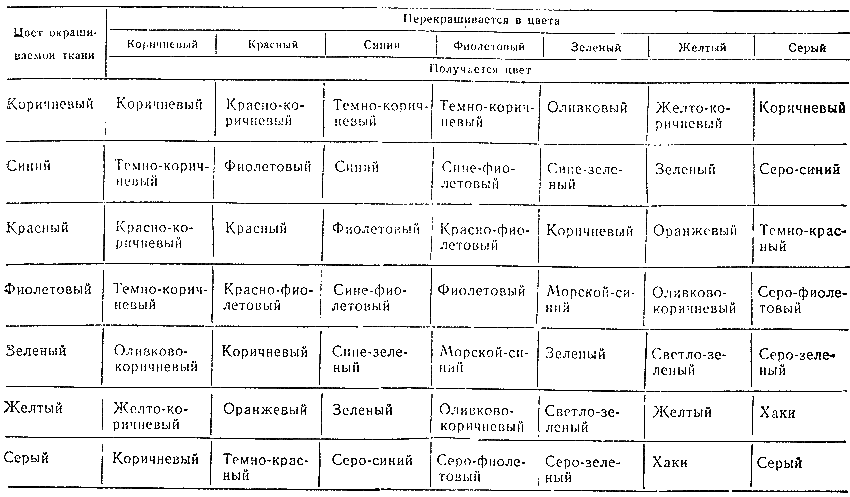Конечный цвет окраски зависит от цвета и глубины первоначальной окраски материала, а также от взятого для перекраски красителя (какой краситель, в каком количестве). Поэтому точно определить заранее конечный цвет окраски, т. е. его оттенок и глубину, очень трудно. Чтобы знать, примерно какой цвет приобретет материал после перекраски, и правильно выбрать краситель, пользуйтесь прилагаемой таблицей (стр. 45). Помните, что при окраске цветного материала всегда получается более темный цвет, чем до крашения.