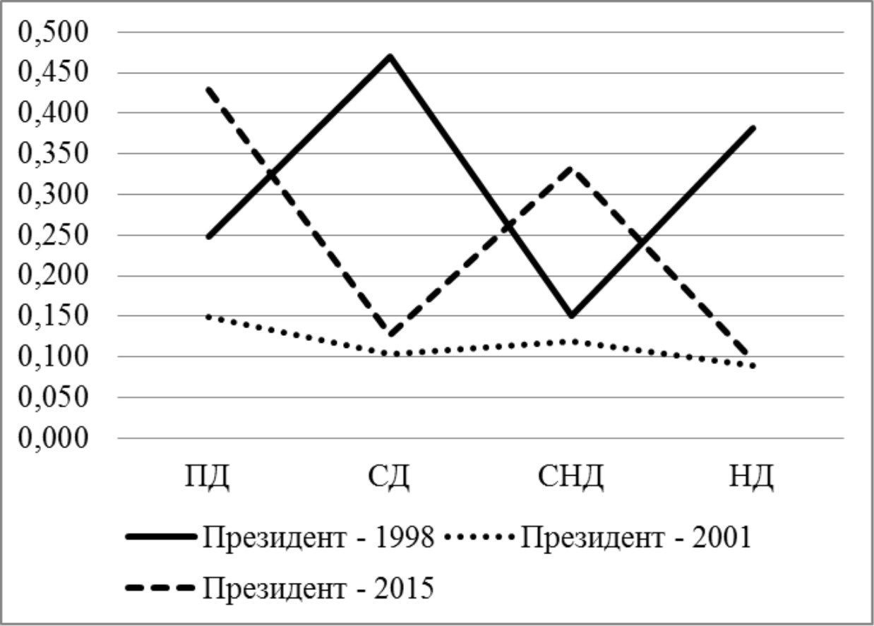 Здесь мы фактически имеем два совершенно разных портрета «полностью доверяющих» и «скорее доверяющих», и оба они не похожи на портреты «скорее не доверяющих» и «совсем не доверяющих». Революция в структуре доверия президентам в промежутке между 1998 и 2015 гг. становится еще более очевидной, когда переходишь к изучению самих портретов, а не структурных соотношений между ними [Сатаров, 2016 b]. Содержательный анализ подтверждает вывод, который можно было сделать на основании последней диаграммы: частоты выбора ответов «полностью доверяю» и «скорее доверяю» нельзя суммировать не только потому, что в данном случае не работает модель смежных интервалов на непрерывной шкале доверия, но и в силу принципиального различия смыслов, вкладываемых респондентами в эти два ответа.