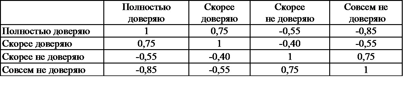 Если вернуться к векторам остатков, то сходство / различие социальных портретов представителей четырех интервалов на непрерывной шкале доверия / недоверия будет выражаться коэффициентами корреляции между векторами остатков. Если описанные предположения верны, то матрица этих коэффициентов может выглядеть примерно так (см. табл. 3 и рис. 10).