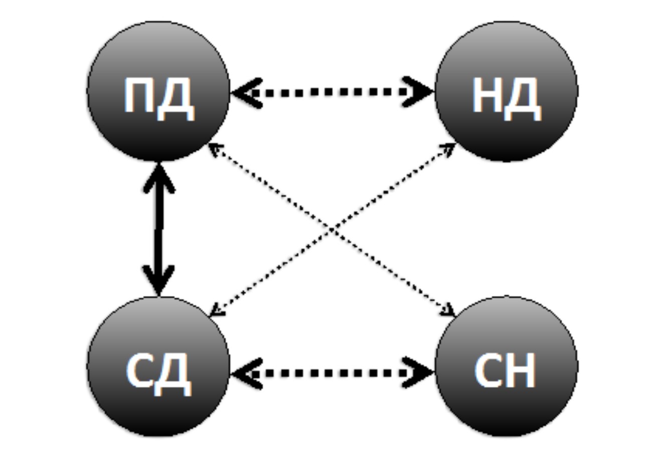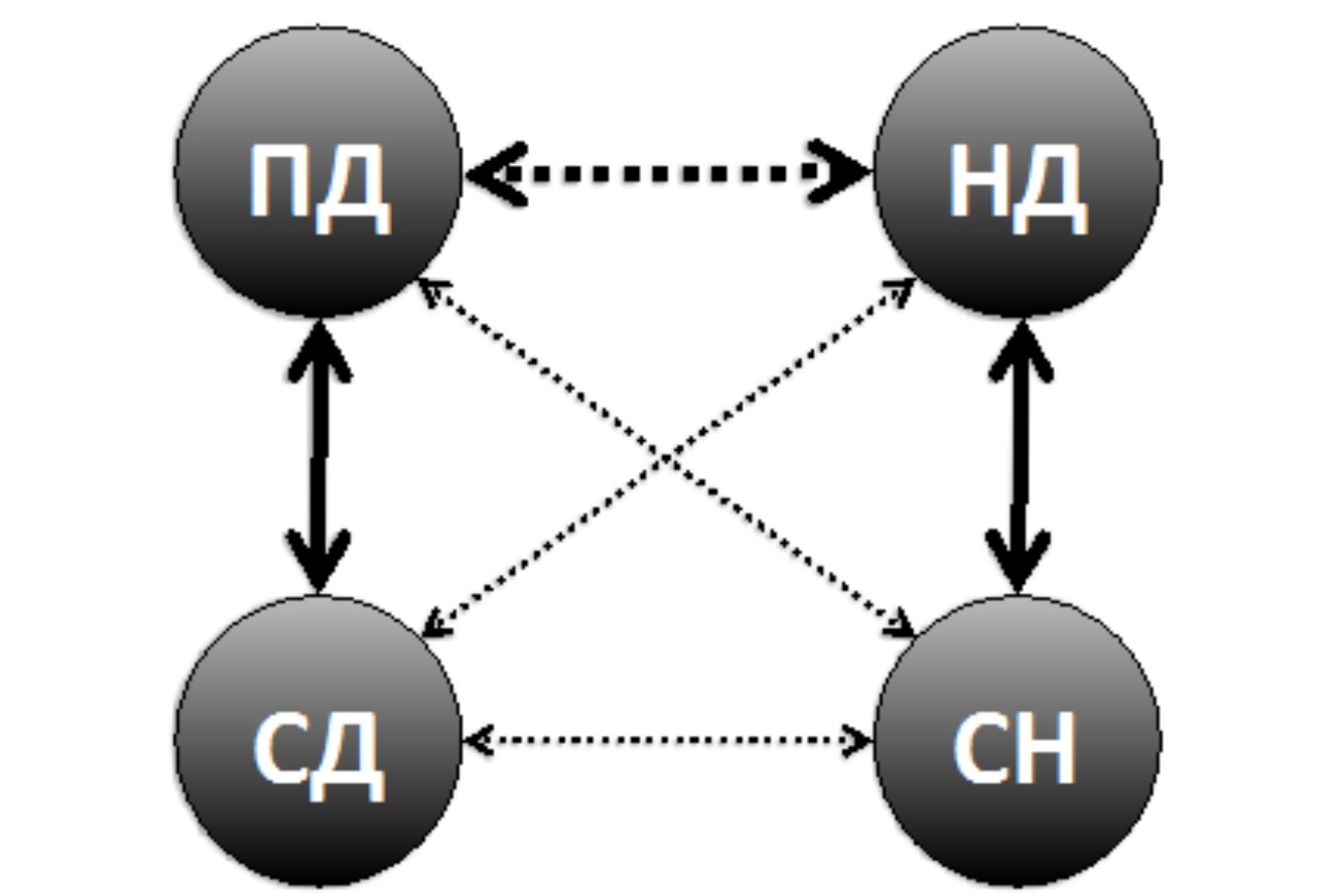 Предполагается, что все корреляции статистически значимы, но в разной степени. На рисунке это отражено толщиной линий: сплошные линии соответствуют положительным зависимостям, пунктирные – отрицательным.