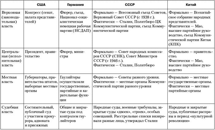 Таблица 13. Политический строй США при Ф. Д. Рузвельте (1932–1945 гг.), Германии при А. Гитлере (1930–1945 гг.), СССР при И. В. Сталине (1929–1953 гг.) и Китая при Мао Цзедуне (1949–1976 гг.)