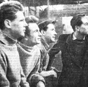 Молодые краснопролетарцы слесарь Анатолий Цветков, токарь Владимир Королев, слесарь Владимир Митюшин, конструктор Юрий Ребров.