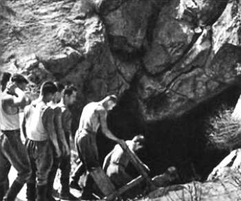 Морщинистая, похожая на лицо древней старухи скала. Беззубым ртом на этом сером лице зияет темное отверстие… Один за другим спускаемся в каменное подземелье. Десять метров вниз по шаткой лестнице, потом спуск пологий, по камням.