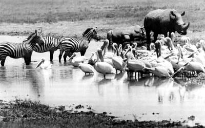 Перед заходом солнца мы снова заглянули на водопой. Толчеи, как в полдень, на озере не было. Два жирафа стояли поодаль, наблюдая за обстановкой. На воде по-прежнему белели важные пеликаны, одинокий буйвол чернел, погрузившись по брюхо в прибрежную грязь, а рядом спокойно паслись носороги. Молчаливая их компания подпустила нас метров на двадцать. Было видно, как звери низко, у самого корня, состригают траву и с видимой благодарностью принимали на свои спины цапель, выбиравших из складок кожи клещей.