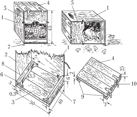 Гнезда для наседок делают из различного материала: деревянные в виде ящиков, проволочные и ивовые в виде корзин. Они могут быть подвесные или напольные. Гнезда должны быть такими, чтобы птица размещалась в них свободно. Размеры гнезд по площади пола для кур – 55×35 см, высота – 60–70 см. Выход из гнезда занавешивают легким соломенным матом, не мешающим наседке выходить из гнезда и входить в него.