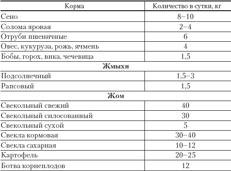 Основным кормом для стельных сухостойных коров должно быть сено хорошего качества, лучше бобовое или бобово-злаковое, не менее 1–1,5 кг на 100 кг живой массы. Заменять сено яровой соломой можно не более 1⁄5 части. Желательно скармливать 1–1,5 кг сенажа, 2–2,5 кг силоса, 1 кг корнеплодов на 100 кг живой массы. Концентраты корове дают 1,5–2 кг в сутки. Лучшими концентратами в этот период являются пшеничные отруби, овсяная дерть, жмыхи и шроты – 1,5–2 кг в день.