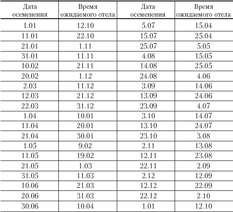 Календарь отела коров приведен в таблице. Начало отела можно заметить по появлению потуг – сокращению брюшного пресса. Обнаружив эти признаки, обмывают заднюю часть туловища и ноги коровы теплой водой с мылом, а затем ополаскивают чистой водой, добавив в нее немного марганцовокислого калия (до розового окрашивания). Загрязненную подстилку в стойле следует убрать и постелить больше сухой и чистой соломы. Надо приготовить мешковину или брезент для приема теленка. Если в помещении достаточно места, корову можно освободить от привязи – она сама примет удобное для нее положение. Коровы чаще всего телятся лежа на правом боку, но иногда, особенно первотелки, могут рожать стоя.