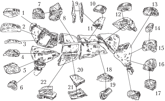 2) «сорочье мясо», т. е. мясо на краях шкуры, обескровленное, светло-желтого цвета;