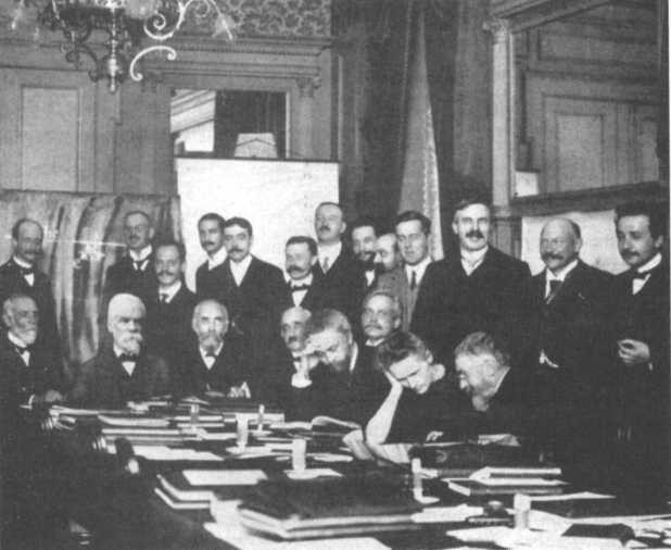 В 1911 году в Брюсселе (Бельгия) был организован первый Сольвеевский конгресс на тему «Радиация и кванты». На нем собрались значительные ученые эпохи, среди которых были Макс Планк (стоит, первый слева), Мария Кюри (сидит, вторая справа), Альберт Эйнштейн (стоит, первый справа) и Эрнест Резерфорд (стоит, третий справа).