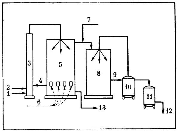 1 — буровая вода; 2 — кислота; 3 — башня подкисления и окисления (хлоратор); 4 — хлор; 5 — башня отдувки элементного иода (десорбер); 6 — воздух; 7 — сернистый газ; 8 — уловитель иода (адсорбер); 9 — иодноватистая и серная кислоты (сорбент); 10 — сборник сорбента; 11 — кристаллизатор (здесь иод выделяется из сорбента); 12 — иод-сырец; 13 — безиодная буровая вода