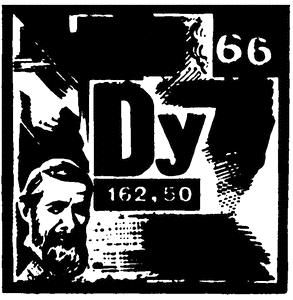 Элемент № 65. В природе существует в виде одного-единственного стабильного изотопа тербий-159. Элемент редкий, дорогой и используемый пока главным образом для изучения его же собственных свойств. Весьма ограниченно соединения тербия используют в люминофорах, лазерных материалах и ферритах. Искусственных изотопов тербия получено довольно много: их массовые числа от 146 до 164, исключая стабильный тербий-159. Все эти шестнадцать изотопов не отличаются долгожительством: самый длинный период полураспада у тербия-157 — больше 100 лет. Тербий-160, получаемый из стабильных тербия-159 и гадолиния-160 в результате ядерных реакций, нашел практическое применение в качестве радиоизотопного индикатора. Период полураспада этого изотопа 72,3 дня.