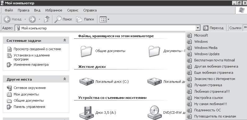 – В-пятых, можно воспользоваться списком ссылок, которые расположены на панели окна Мой компьютер или Проводника и которые нам любезно и настойчиво предлагают разработчики Windows (рис. 5.3).