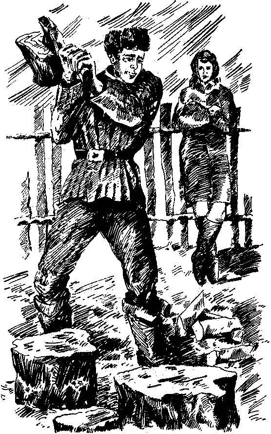 Это Егор. Он красный от мороза, в стеганке, перетянутой в поясе широким солдатским ремнем. Снимает рукавицы, кладет их на снег, берет топор, взвешивает его в руке.