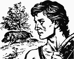 Кабаненок забился сильнее; тогда охотник вынул из-за ременного пояса тяжелый черный камень, острый с одного конца и тупой с другого, насаженный на дубовую рукоятку и тщательно отшлифованный со всех сторон. Ударом в лоб охотник оглушил кабаненка, и тот замер на месте, вытянув задние ноги. Охотник присел на корточки, погладил рукой жертву и зашептал: