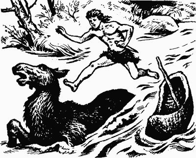 Лосиха фыркнула, и оба зверя повернули назад. Но было уже поздно. Несколькими сильными взмахами шеста Уоми разогнал лодку и ловко направил ее на лосиху. Прежде чем она успела добраться до мелкого места, Уоми уже нагнал ее и вдруг, выхватив бронзовый кинжал, прыгнул прямо на загривок перепуганному животному.
