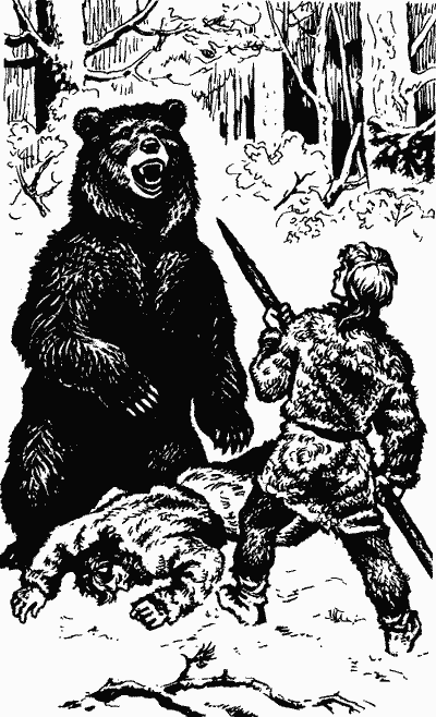 В это время подоспел Тэкту и ткнул медведя рогатиной. Этот удар был уже лишним: копье Уоми и без того пробило медведю сердце.
