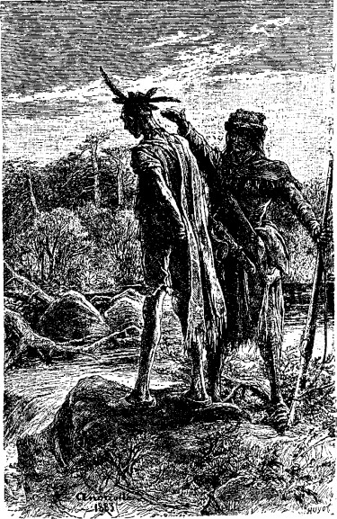 Разведчик бросил взгляд на солнце, которое уже садилось, и пошел вперед с быстротой, заставившей Хейворда и Мунро напрячь все силы. Теперь их дорога шла лощиной, о которой уже говорилось раньше. Движение преследователей было уверенное, так как тут гуроны даже не пробовали скрывать свои следы. Однако менее чем через час Соколиный Глаз значительно сбавил шаг; он то и дело поглядывал то в одну, то в другую сторону, как будто чувствовал приближающуюся опасность. Наконец он остановился, поджидая остальных.