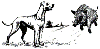 В эту минуту из кустов выскочили собаки. Деле попробовал решительно атаковать, но кабан приготовился к бегству. Деле, прыгнув ему на шею, был отброшен. Так же и Диабло, который попытался схватить его за бок. Сильным ударом копыт кабан подкинул его в воздух. Дей и Пилон, более опытные, на почтительном расстоянии справа и слева бежали рядом с убегающим кабаном и выжидали момент для нападения.
