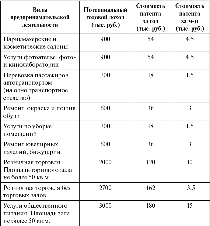 В качестве примера приведем размер потенциально возможного дохода по некоторым видам предпринимательской деятельности в г. Москве.