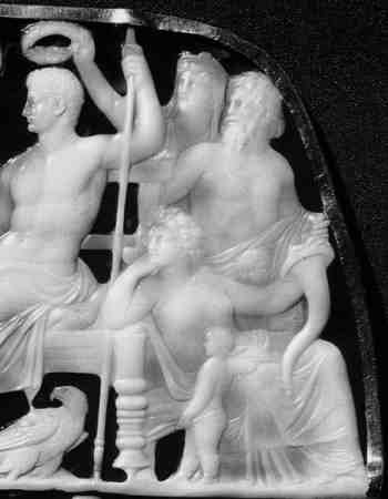Рис. 7.6. «Гемма Августа». Датируется историками 10 годом н. э. [730:2], с. 82. Считается, что изображения на этом резном камне посвящены римскому императору Августу, жившему, по мнению историков, в начале I века н. э. Однако гороскоп, помещенный здесь в верхнем ряду, однозначно указывает на совсем другую дату: 8 декабря 1284 года н. э. Взято из [730:2], с. 82.